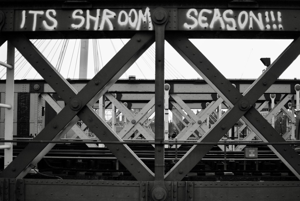 I may well have been on my way to London’s most renowned graffiti spot but to say this caught my eye would be the biggest understatement. Not only is the bold white message ‘Its Shroom Season!!!’ classic rebellion language, it was painted on a bridge that was doing everything in its power to stop it from happening.