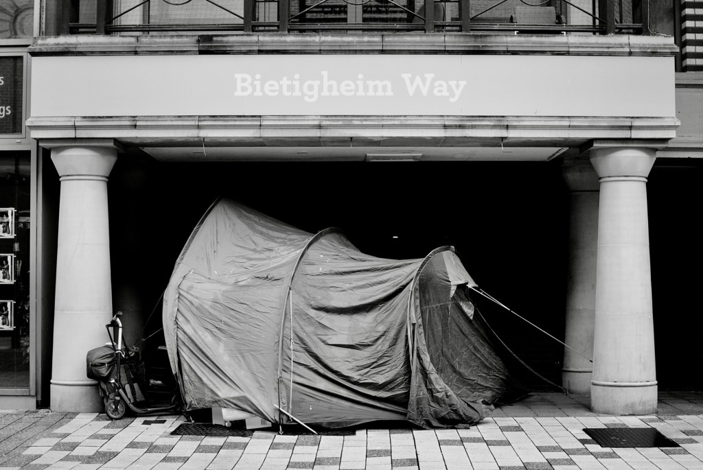 The situation here is beyond saddening. This covered doorway had become home to someone. Not a place to crash for a few hours overnight. A space that was harbouring someone’s life. The bags, boxes, scooter and other collections of their belongings took this from being a place to hide from the rain. It was their full time, everything is here, home.