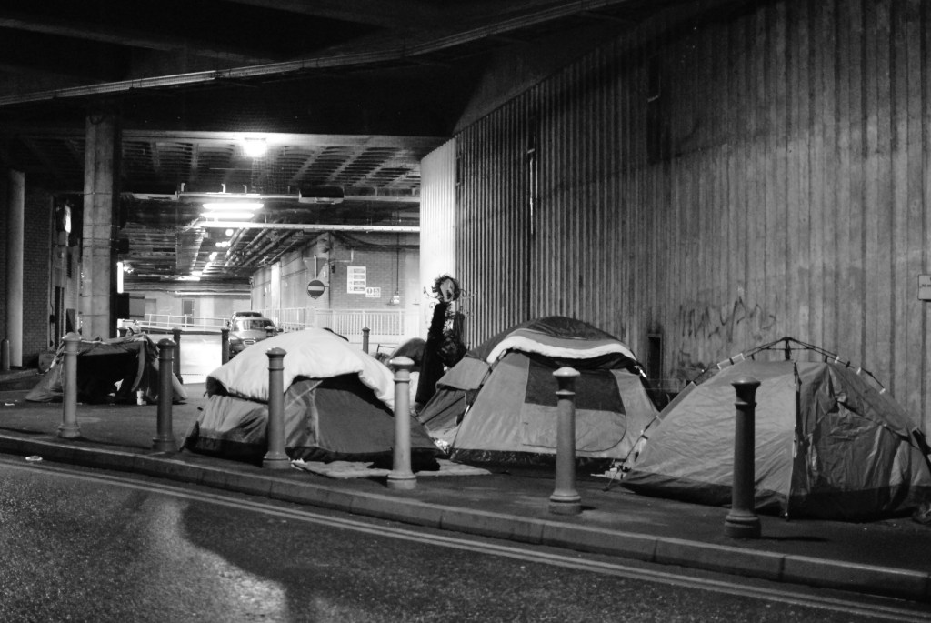 As I walked along the one way system, heading down hill to what essentially was an underground entrance to a theatre and a multi-storey car park, I caught a glimpse of of a small tent standing behind some traffic bollards. There, sheltered from a least some of the elements and bathed in the glaring lights of this concrete covered cavern, was a gathering of small tents, odd chairs and old pallets. This wasn’t a scene that I had expected to come across in the UK, let alone in a town centre on a random Friday night. Somehow though, amongst the painfully obvious distress and difficulty of this living situation, there was a feeling of ownership.
